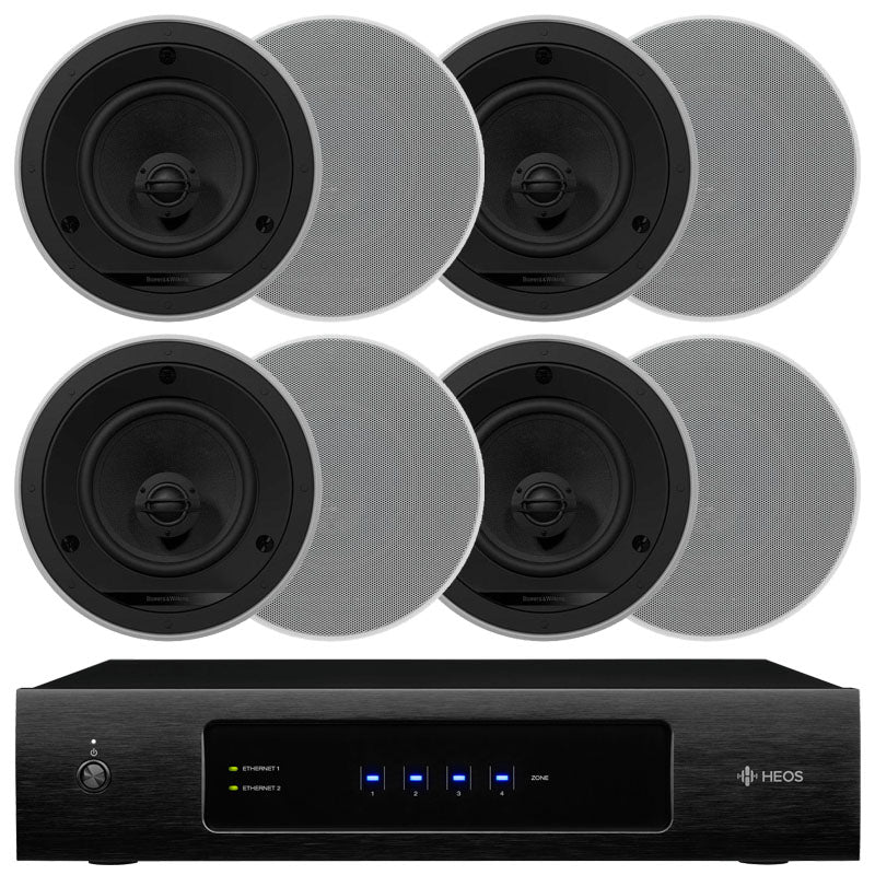 This is a package consisting of a Denon HEOS Drive HS2 4-zone streaming amplifier and 8 x Bowers & Wilkins CCM665 in-ceiling speakers (4 pairs).