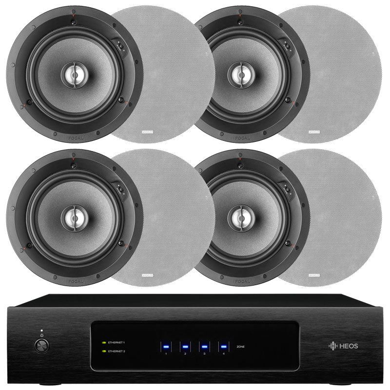 This is a package consisting of a Denon HEOS Drive HS2 4-zone streaming amplifier and 8 x Focal 100 ICW6 in-ceiling speakers (4 pairs).