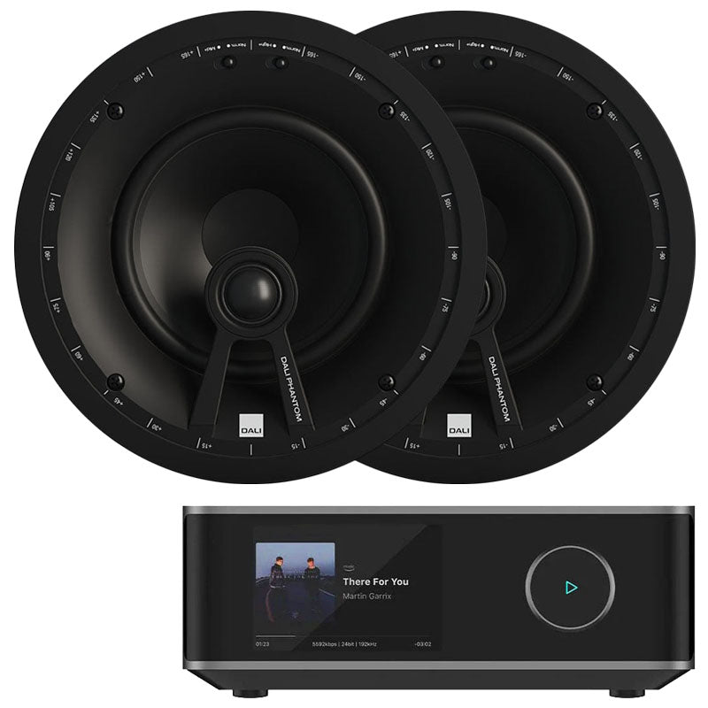 This package consists of a WiiM Amp Ultra (Space Grey) and 2 x Dali Phantom E-60 WR IP65 Ceiling Speakers.