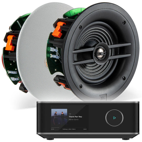 This package consists of a WiiM Amp Ultra (Space Grey) and 2 x JBL Stage 260C Ceiling Speakers.