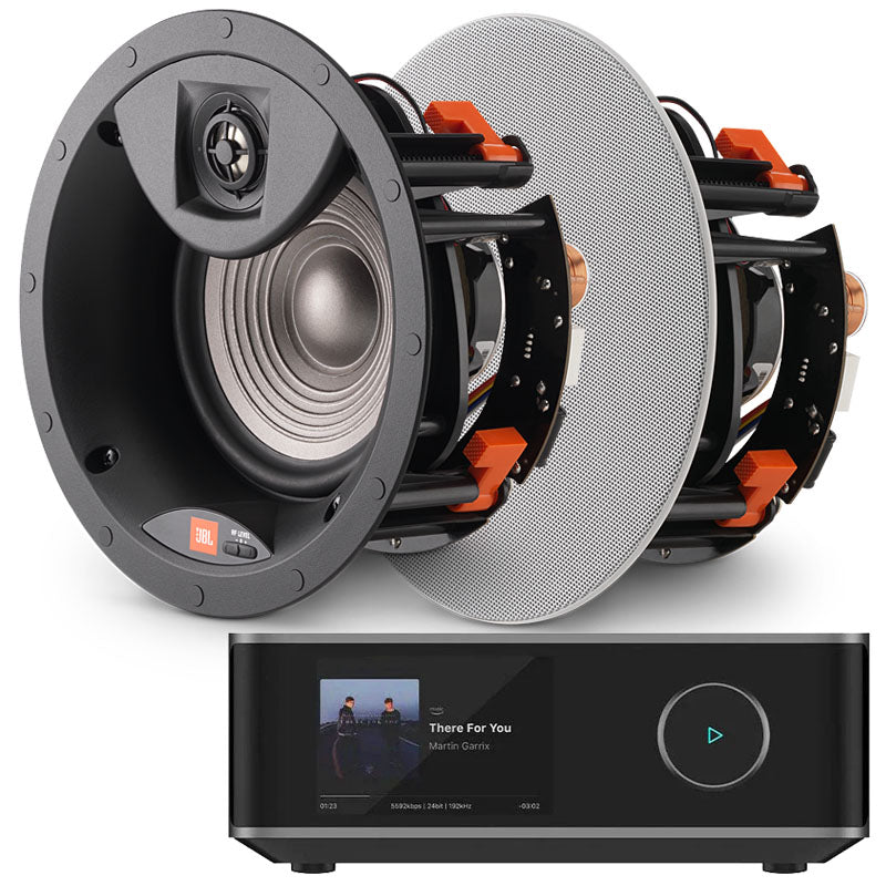 This package consists of a WiiM Amp Ultra (Space Grey) and 2 x JBL Studio 2 6IC In-Ceiling Speakers.