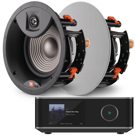 This package consists of a WiiM Amp Ultra (Space Grey) and 2 x JBL Studio 2 8IC In-Ceiling Speakers.